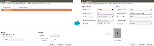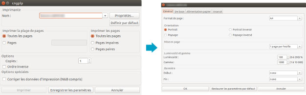 L'installation de ce pilote vous permet d'imprimer en utilisant des fonctions intégrées au périphérique à partir de l'écran de paramètres et de la ligne de commande de l'interface graphique (Graphical User Interface).