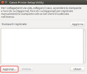 Se non è possibile eseguire correttamente la stampa con la stampante registrata, utilizzare Canon Printer Setup Utility per eliminare la stampante facendo clic su [Elimina], quindi registrare nuovamente la stampante facendo clic su [Aggiungi].