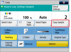 [Copy Sample] appears only if you set to make multiple copies of your original in [Collate (Page Order)], [Offset], [Rotate 90 Degrees], [Staple], [Add Cover], [Insert Sheets], [Booklet], or [Transparency Cover Sheets].