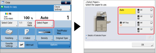If [Paper Drawer Auto Selection Based on Color] is set in [Function Settings] (Settings/Registration), automatic paper selection can be performed based on the selected colour mode when copying. (See "Specifying Paper Drawer Auto Selection Based on Colour.")