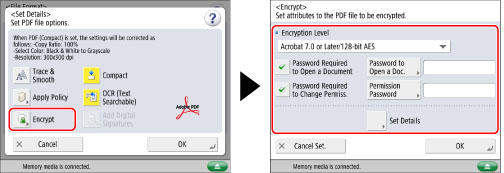 * Appears only if you select [Acrobat 9.0 or Equivalent] in [256-bit AES Settings for Encrypted PDF] in [Function Settings] (Settings/Registration). (See "Changing the PDF Encryption Level from Acrobat 10.0 or Equivalent to Acrobat 9.0 or Equivalent.")