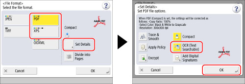 If you select PDF or XPS as the file format, you can set [Compact] and [OCR (Text Searchable)] at the same time. In that case, [PDF (Compact)] or [XPS (Compact)] is displayed as the file format on the Scan and Send Basic Features screen.