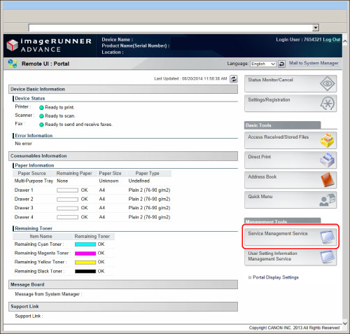 If SMS is idle for longer than five minutes, it will timeout and you are automatically logged out. If this happens, log in again from the [Login] page. The estimated time until a timeout occurs is displayed on the top right of the screen.