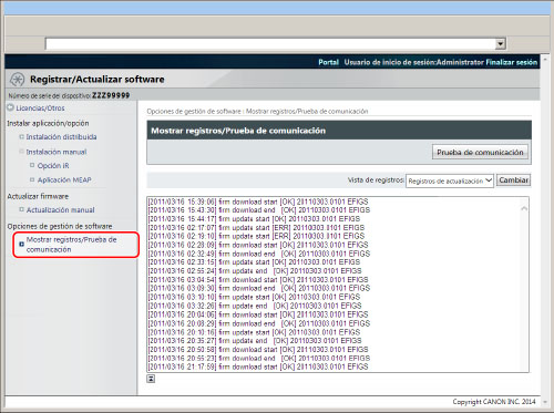 Pulse [Opciones de gestión de software] → [Sel. vista reg.] → [Mostrar registros de actualización].