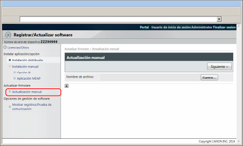Desde la página del portal de IU remota, haga clic en [Configuración] → [Licencias/Otros] → [Registrar/Actualizar software].