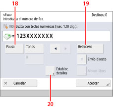 Se pulsa para insertar una pausa de varios segundos en el número de fax que se está marcando. Si pulsa [Pausa] entre números, aparece la letra <p> entre ellos. Si pulsa [Pausa] al final de un número, aparece la letra <P> al final de ese número. Al marcar un número del extranjero, inserte una pausa después del prefijo de país y al final del número de teléfono. (Consulte "Duración de pausa".)