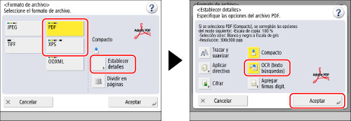 Si selecciona PDF o XPS como formato de archivo, podrá establecer al mismo tiempo [Compacto] y [OCR (texto búsquedas)]. En este caso, [PDF (Compacto)] o [XPS (Compacto)] se mostrará como formato de archivo en la pantalla Leer y enviar Funciones básicas.