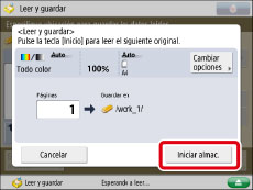 Puede seleccionar y guardar hasta 999 páginas a la vez. Si los originales de doble cara se leen usando el alimentador, se pueden guardar hasta 1.000 páginas. Cuando se llega al máximo de originales que se pueden leer, aparece un mensaje preguntándole si quiere guardarlos.