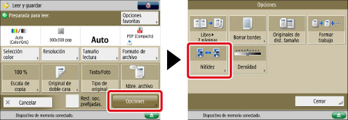 Si utiliza el espacio avanzado de otro equipo de la red o un dispositivo de memoria, la opción para [Nitidez] no es válida si se cumplen todas estas condiciones. La opción se refleja en la imagen mostrada para [Mostrar imagen], pero no para la imagen leída real.
