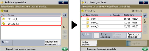 Si hay dos o más archivos guardados en la carpeta, puede pulsar [Nombre] o [Fecha/hora] para ordenar la lista de archivos.