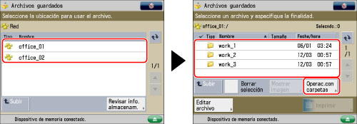 Seleccione la ubicación de almacenamiento que desee → seleccione el nivel de carpeta adecuado → pulse [Operac.con carpetas].