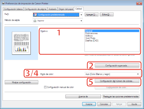 Para conocer las instrucciones acerca de cómo mostrar la pantalla del controlador de impresora, consulte "Impresión" o "Configurar las opciones de impresión prefijadas".