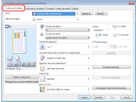 La opción [Impresión a una cara] se selecciona en [Una cara/Doble cara/Impresión en cuadernillo] en la ficha [Configuración básica]. Para información detallada, consulte "Impresión a una cara y a doble cara".