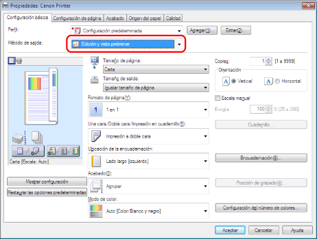 Seleccione [Edición y vista preliminar] en [Método de salida].