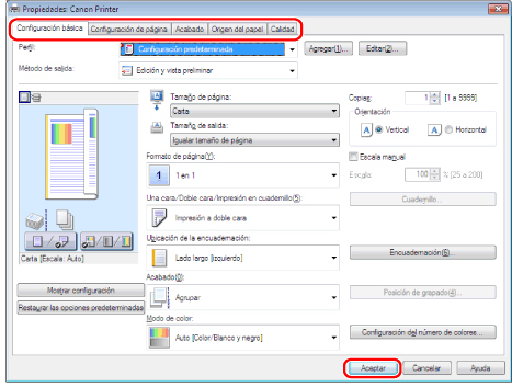 Para conocer las instrucciones acerca de cómo mostrar la pantalla del controlador de impresora, consulte "Impresión" o "Configurar las opciones de impresión prefijadas".