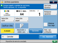 Si desea imprimir un archivo guardado en el equipo desde un ordenador con las opciones que se establecieron cuando se guardó el archivo, no imprima el archivo desde la pantalla Cambiar opciones de impresión. Si lo hace, el archivo puede no imprimirse con las mismas opciones que se establecieron cuando se guardó.