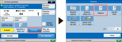 Asimismo, puede seleccionar texto que se haya guardado en [Guardar caract. para numerar págs/Filigrana]. (Consulte "Guardar/editar/eliminar texto definido por el usuario para números de página y filigranas".)
