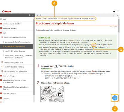 Cliquez ici pour définir les paramètres tels que la taille du texte, la mise en page et la méthode d'affichage du manuel électronique.