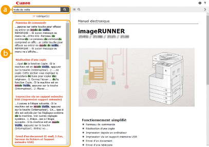 Affiche les résultats de recherche des pages contenant les mots-clefs spécifiés. À partir des résultats, localisez la page qui vous intéresse et cliquez sur le titre de rubrique de cette page.