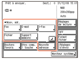 Vous pouvez également spécifier le destinataire à l’aide du [Carnet d’adresses], des [Boutons favoris] ou des [Btns comp. 1 touche]. Ces fonctions vous évitent de spécifier le destinataire chaque fois que vous envoyez des documents.