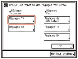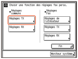 Appuyez sur [Réglages de communication] → appuyez sur [Réglages TX] sous <Réglages communs>.