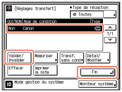 Sélectionnez le réglage de transfert de votre choix → appuyez sur [Valider/ Invalider] → appuyez sur [Fin]. Pour revenir à l’écran principal, appuyez sur