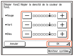 Appuyez sur [-] ou [+] pour définir la quantité de chaque couleur → appuyez sur [OK] → appuyez sur [OK].