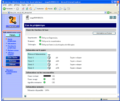 Affiche le statut de la machine, comme la mémoire disponible, la disponibilité des consommables et les informations d'erreurs, le cas échéant. Pour vérifier les détails de l'erreur, cliquez sur [Information sur l'erreur].