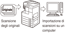 La funzione Scansione remota consente di utilizzare la macchina come uno scanner tradizionale. È possibile digitalizzare un documento con la macchina e leggere i dati in un'applicazione TWAIN compatibile sul computer. Per utilizzare questa funzione la macchina deve essere collegata a una rete IPv4 e sul computer deve essere installato il software Color Network ScanGear*.