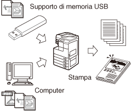(Vedere la guida del driver di stampa.) Se si stampano file TIFF/JPEG, è possibile stampare da un supporto di memoria USB inserendolo direttamente nella macchina e selezionando le immagini desiderate sul display del pannello tattile.