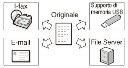 La funzione di Invio consente di inviare immagini acquisite o dati di documenti a file server o a supporti di memoria USB, oppure tramite e-mail o I-fax. La funzione supporta diversi formati di file, compresi TIFF, JPEG e PDF (con alcune varianti) per l'invio di scansioni in bianco e nero o a colori. (I formati di file disponibili variano in base ai modi selezionati e alla configurazione della macchina.)