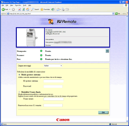 Per prima cosa impostare l'indirizzo IP (Internet Protocol) per la macchina dal pannello di controllo della macchina e impostare la connessione di rete necessaria. Quindi avviare il browser web e immettere l'indirizzo IP della macchina. Sullo schermo del computer viene visualizzata la pagina principale dell'Interfaccia Utente Remota; ora è possibile accedere.