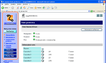 Dopo aver eseguito l'accesso all'IU Remota, viene visualizzata la pagina dello Stato periferica. Nel riquadro sinistro di tale pagina vengono visualizzati i pulsanti elencati qui di seguito che consentono di accedere ad altre pagine dell'Interfaccia Utente Remota e di eseguire operazioni da tali pagine.