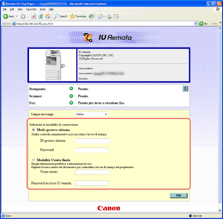 Per accedere all'IU remota nel Modo gestore sistema, selezionare il pulsante di opzione [Modo gestore sistema] → immettere l'ID del gestore del sistema e la password di sistema.