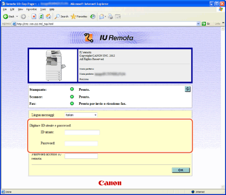 Se si esegue l'accesso alla IU remota in Modalità Utente finale e si desidera eliminare un proprio lavoro di stampa, immettere il nome utente con il quale è stato inviato il lavoro di stampa (normalmente è il nome del proprio computer). Diversamente, fare clic su [OK] per accedere alla IU remota con la casella di testo [Nome utente] vuota. (Vedere la nota a Modalità di connessione dell'Interfaccia Utente Remota.)