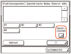 Wenn eine Speichertaste nicht verwendet wird, wie beispielsweise, wenn Sie die darunter gespeicherten Einstellungen löschen, ist die Taste [OK] abgeblendet. Dann müssen Sie [Abbruch] → [Fertig] betätigen, um den Vorgang abzuschließen.