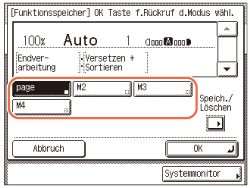 Bei Auswahl einer Taste ohne gespeicherte Kopiereinstellungen ist die Taste [OK] abgeblendet und kann nicht betätigt werden. Wählen Sie eine andere Taste aus, unter der Kopiereinstellungen gespeichert sind, oder betätigen Sie [Abbruch].