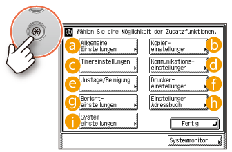 (Zusatzfunktionen) auf dem Bedienfeld des Systems betätigen, wird der Bildschirm „Zusatzfunktionen“ angezeigt. Auf diesem Bildschirm können Sie die verschiedenen Einstellungen des Systems anpassen. Wenn diese Einstellungen geändert oder festgelegt werden, werden sie als Standardeinstellungen gespeichert und bleiben aktiv, bis sie wieder geändert werden.
