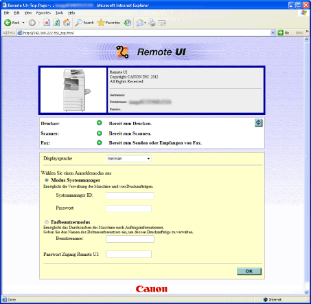 Legen Sie zuerst die IP-Adresse (Internet Protocol) des Systems über das Bedienfeld des Systems fest und richten Sie die benötigte Netzwerkverbindung ein. Dann starten Sie den Web-Browser und geben die IP-Adresse des Systems ein. Die Hauptseite der Remote UI wird auf Ihrem Computerbildschirm angezeigt und Sie können sich anmelden.