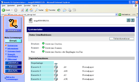 Nachdem Sie sich bei der Remote UI angemeldet haben, wird die Seite Systemstatus angezeigt. Im linken Bereich der Seite werden die unten aufgeführten Schaltflächen aufgeführt, über die Sie auf die Optionen der anderen Remote UI-Seiten zugreifen und diese nutzen können.