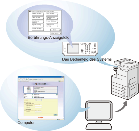 Die Software Remote UI (Remote User Interface, Remote-Benutzeroberfläche) ist beim System vorinstalliert und ermöglicht es Ihnen, auf die Funktionen des Systems über einen Web-Browser zuzugreifen. Mit der Remote UI können Sie z. B. den Auftragsstatus überprüfen, Aufträge löschen und verschiedene Einstellungen bearbeiten. Um die Remote UI zu nutzen, benötigen Sie nur einen Web-Browser und eine Netzwerkverbindung zwischen Ihrem Computer und dem System.