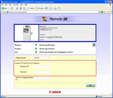 Wählen Sie den Anmeldemodus und geben Sie die Systemmanager ID und das Systempasswort oder den Anwendernamen und das Passwort für den Remote-UI-Zugriff ein.