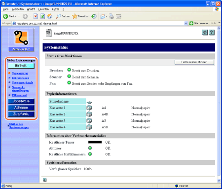 Zeigt den Systemstaus wie verfügbaren Speicher, Verfügbarkeit des Verbrauchmaterials und Fehlerinformationen an, falls diese vorliegen. Zum Prüfen von Detailinformationen zum Fehler klicken Sie auf [Fehlerinformationen].