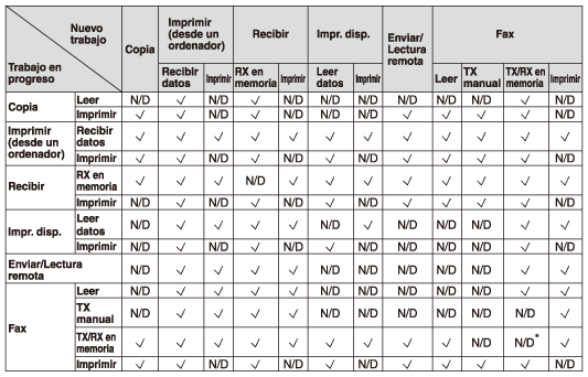 El equipo permite utilizar varias funciones como imprimir, leer y copiar, conjuntamente. La tabla muestra qué operaciones multifunción se pueden realizar de forma conjunta.
