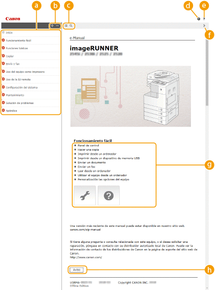 Haga clic para mostrar información sobre cómo ver el e-Manual, cómo realizar una búsqueda y otra información.