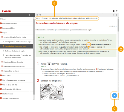 Haga clic para especificar ajustes como el tamaño del texto, la distribución y el método de visualización del e-Manual.