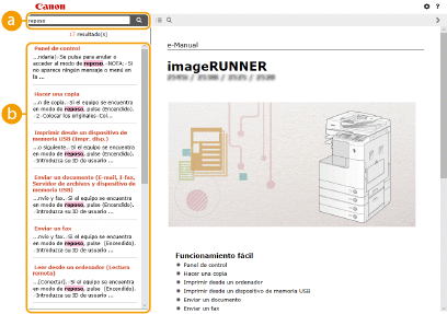 para mostrar la pantalla de búsqueda. Contiene un cuadro de texto para realizar una búsqueda por palabra clave y encontrar la página que está buscando.