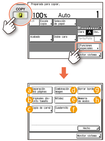 Esta sección describe los procedimientos de operación para los modos de copia, a los que puede acceder con la tecla [Funciones especiales] de la pantalla principal de la función Copia.