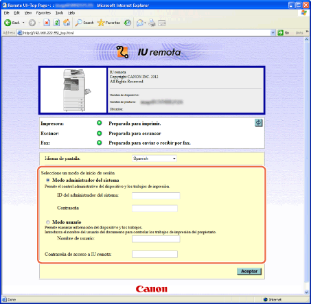 Seleccione el modo de inicio de sesión e introduzca el ID del administrador del sistema y la contraseña del sistema, o el nombre de usuario y la contraseña de acceso de la IU remota.