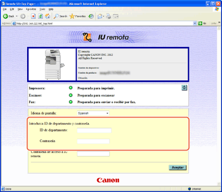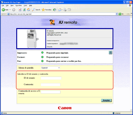 Si va a conectarse a la interfaz de usuario remoto en Modo usuario y quiere eliminar un trabajo de impresión propio, introduzca el nombre de usuario con el que envió el trabajo de impresión (normalmente, el nombre de usuario del ordenador). En caso contrario, haga clic en [Aceptar] para conectarse a la interfaz de usuario remoto con el cuadro de texto [Nombre de usuario] en blanco. (Consulte la nota en Modos de inicio de sesión de la interfaz de usuario remoto.)